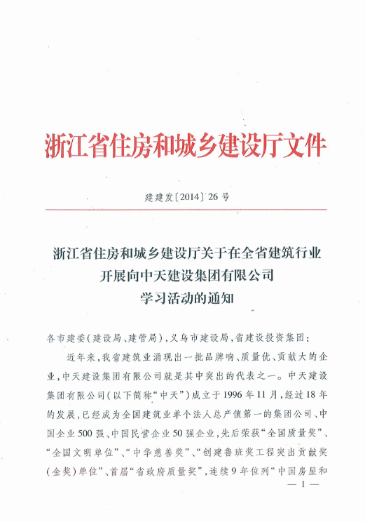 《浙江省住房和城乡建设厅关于在全省建筑行业开展向3044永利建设集团有限公司学习活动的通知》